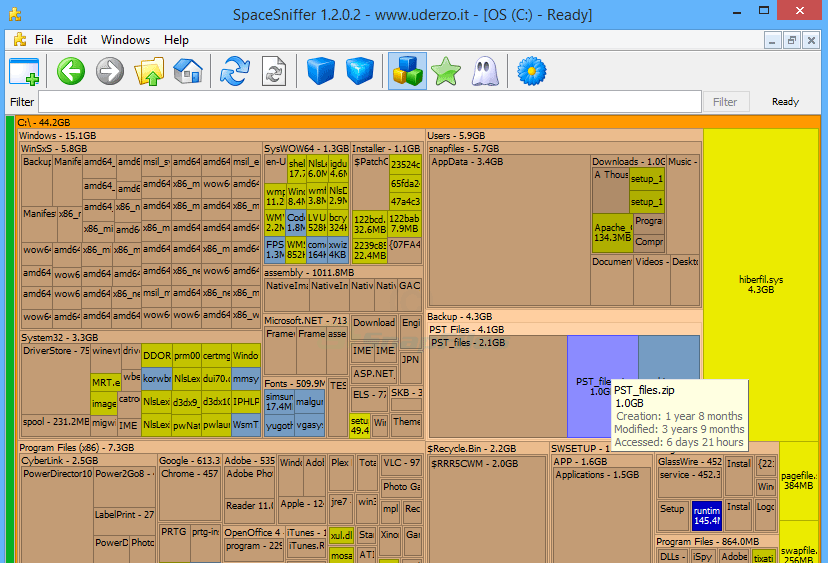 SpaceSniffer also allows you to filter files by size, date, and type to help