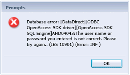 SDK driver][OpenAccess SDK SQL Engine]AHD04043:The user name or password you